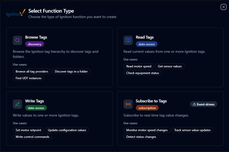 Purpose: Creates subscriptions to Ignition tags. When tag values change, events are automatically pushed to connected pipelines. This function is event-driven and cannot be tested directly.