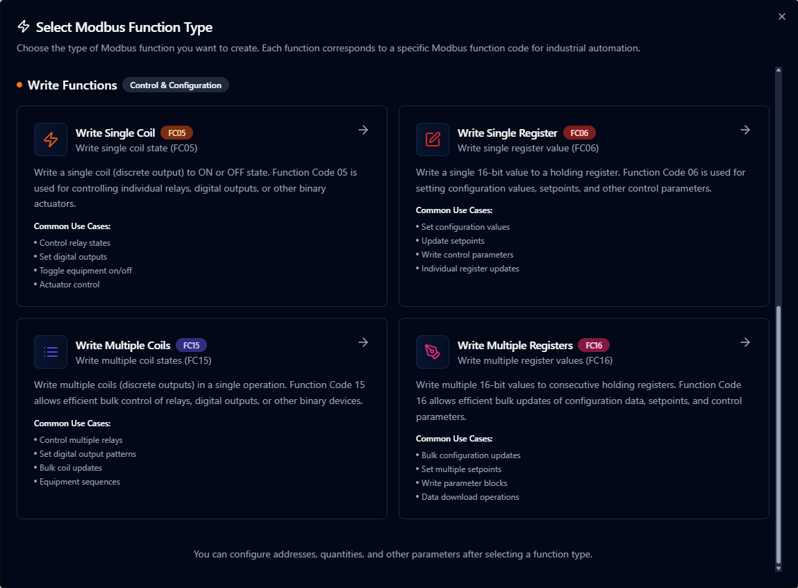 - Choose a Read function (FC01–FC04) or a Write function (FC05–FC06, FC15–FC16)