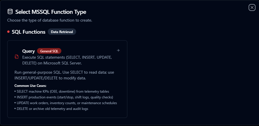 Use the Microsoft SQL Server query functions you publish here as nodes inside the Pipeline Designer to keep plant-floor activity aligned with enterprise data. Drag the query node into your flow, bind parameters to upstream outputs or constants, and adjust error handling or retry behavior directly on the canvas.