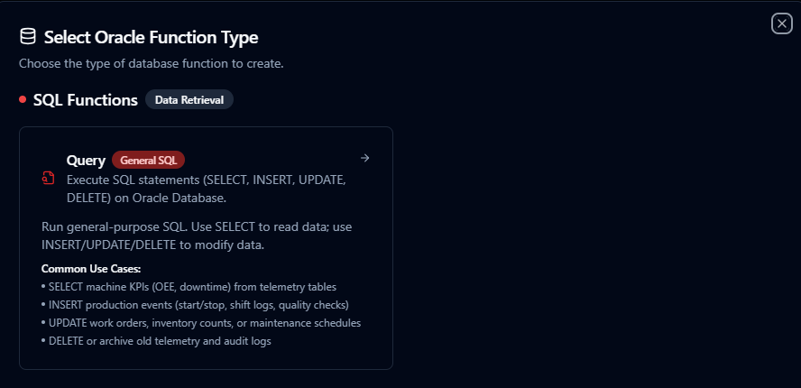 Use the Oracle Database query functions you publish here as nodes inside the Pipeline Designer to keep plant-floor activity aligned with enterprise data. Drag the query node into your flow, bind parameters to upstream outputs or constants, and adjust error handling or retry behavior directly on the canvas.
