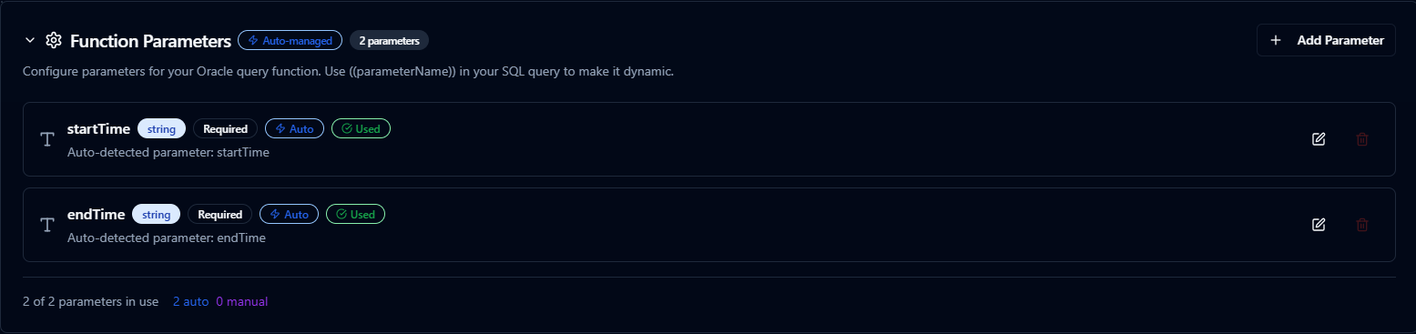 Oracle query function editor with SQL/PL-SQL and parameter binding