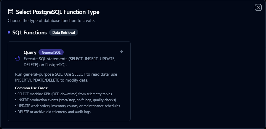 Use the PostgreSQL query functions you create here as nodes inside the Pipeline Designer to move data in and out of your database alongside the rest of your operations stack. Drag the query node onto the canvas, bind its parameters to upstream outputs or constants, and configure connection-level options without leaving the designer.