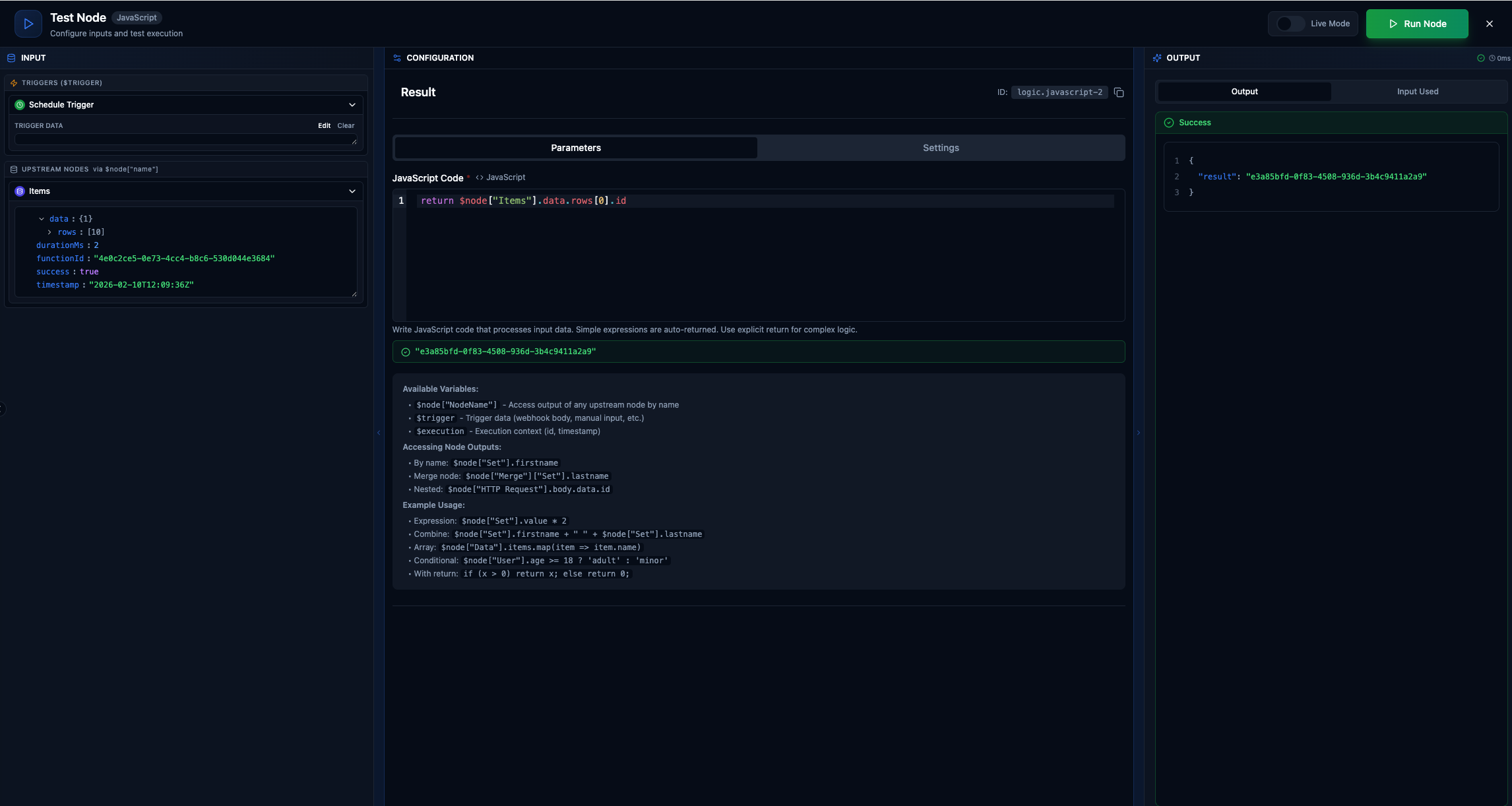 If an upstream node has no output yet, a Run button appears. Click it and the system executes all required dependencies in the correct order automatically. Drag any field from the JSON tree directly into an expression input in the CONFIGURATION column.