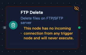 Function ParametersDynamicVariesAuto-populated from the function schema (e.g., remotePath). See your FTP/SFTP connection functions for full parameter details.
