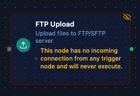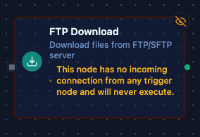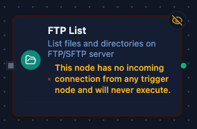 FTP/SFTP nodes enable pipelines to transfer files to and from remote servers. Use these nodes to automate file-based integrations, data imports/exports, and partner data exchanges. All four node types support both FTP and SFTP protocols through your configured connections.