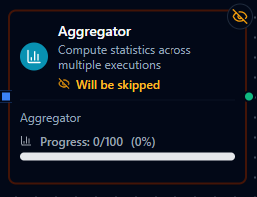 The Aggregator Node collects numeric values from successive pipeline executions and computes statistics—average, minimum, maximum, sum, or count—once a configurable window of values has been reached. While the window is filling, downstream nodes are skipped; when the window is full, the node emits the computed results and resets for the next window.