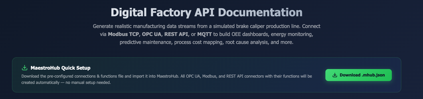 The DFS web application includes an API Docs page with a MaestroHub Quick Setup section. From there, you can download a pre-configured .mhub.json file that contains all OPC UA, Modbus, and REST API connections along with their functions. This file can then be imported into MaestroHub through the UI, which automatically creates all connectors and their functions with no manual setup needed.