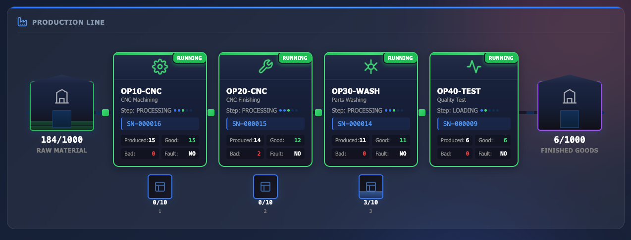 Buffers between stations have a capacity of 10 parts each. The raw material buffer (before OP10) and finished goods buffer (after OP40) each hold up to 1000 parts. Each part entering the line is automatically assigned a serial number (e.g., SN-000001) and is tracked through all stations for full traceability.