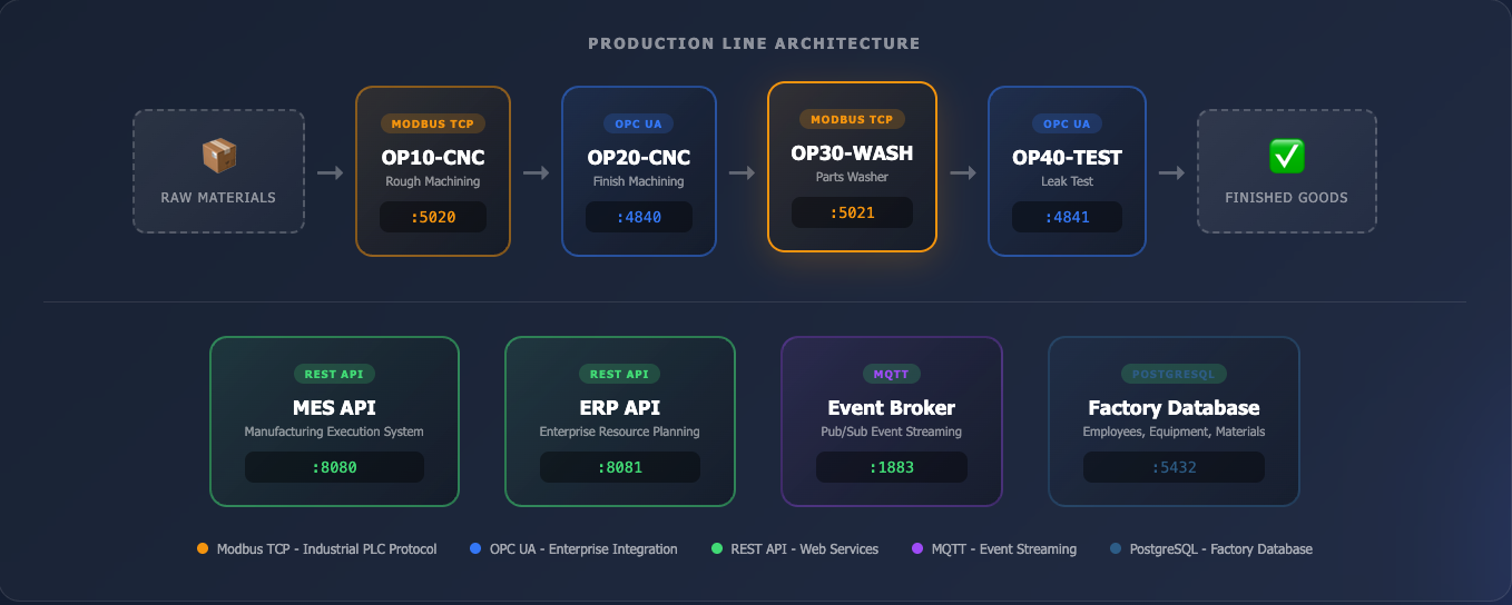 The Digital Factory Simulator (DFS) is a software application written in Go that simulates a realistic brake caliper body manufacturing line. It runs as a single binary and exposes industrial protocols (OPC UA, Modbus TCP, MQTT), REST APIs, a web dashboard, and an embedded PostgreSQL database, allowing external systems to interact with the simulated factory as if it were a real production environment.