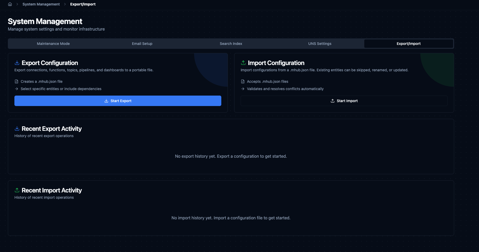 To import the downloaded file into MaestroHub, navigate to System Management > Export/Import and use the Import Configuration section. Click Start Import, select the .mhub.json file, and MaestroHub will validate and resolve any conflicts automatically.