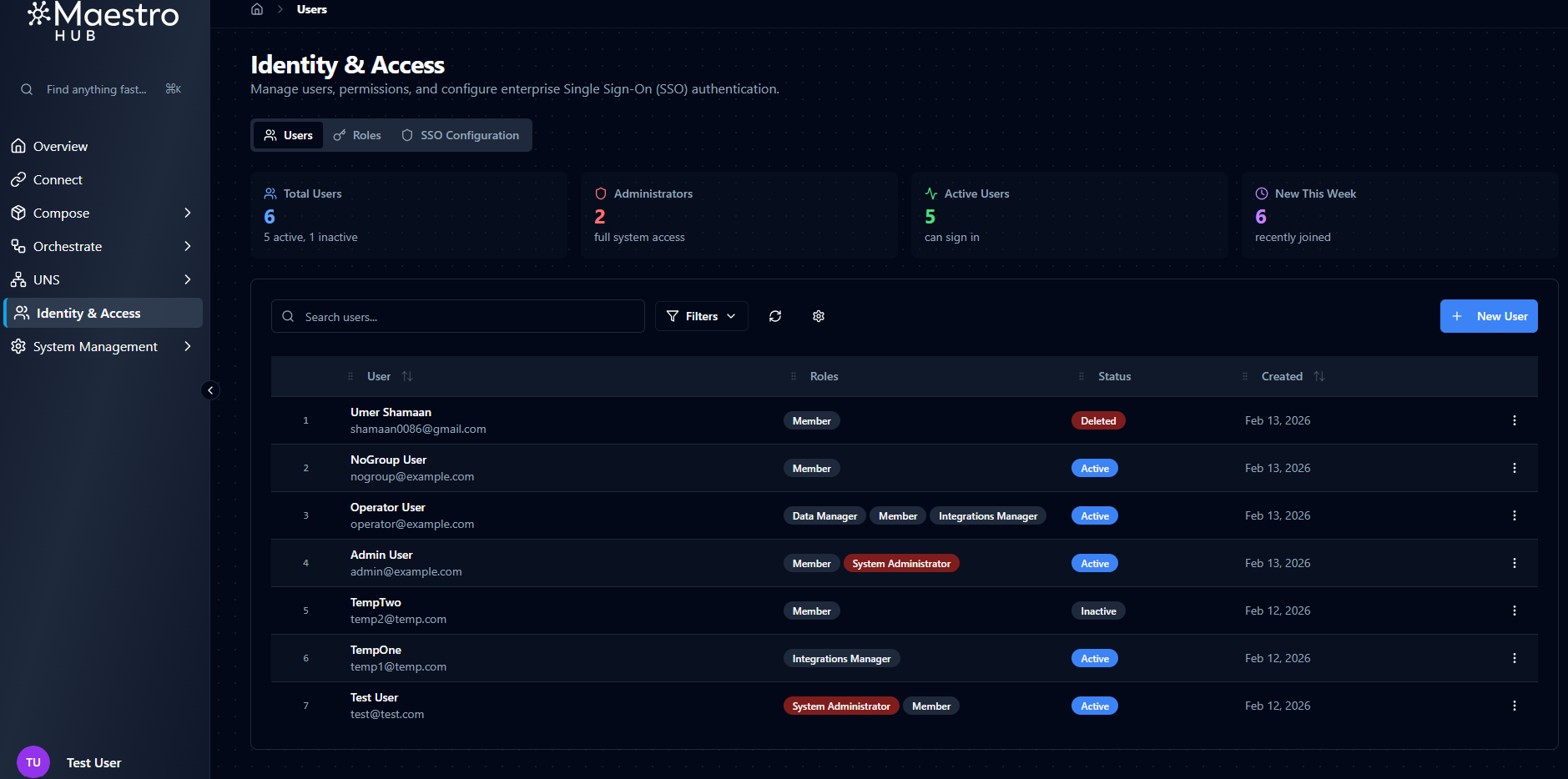 The Identity & Access module provides two tabs — Users and Roles — for managing user accounts and controlling what each person can do on the platform.