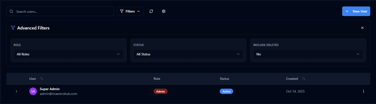 All,Active, orInactiveusers. - Include Deleted — Toggle to surface soft-deleted accounts alongside active ones.