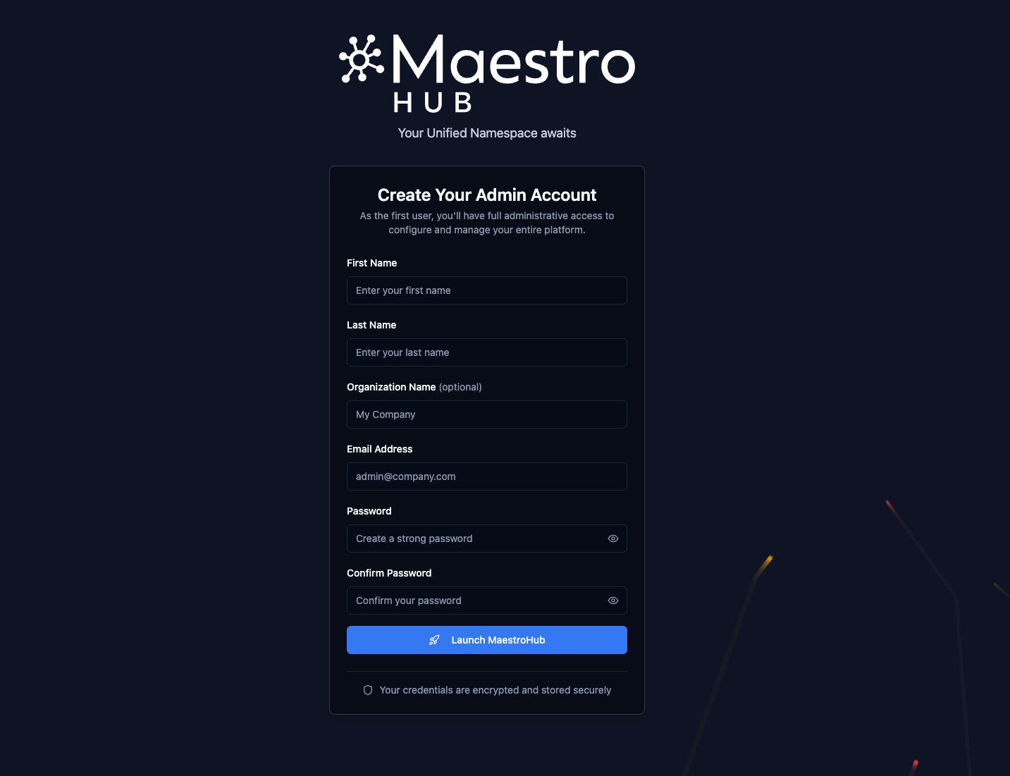Create your initial administrator account to get started with MaestroHub.