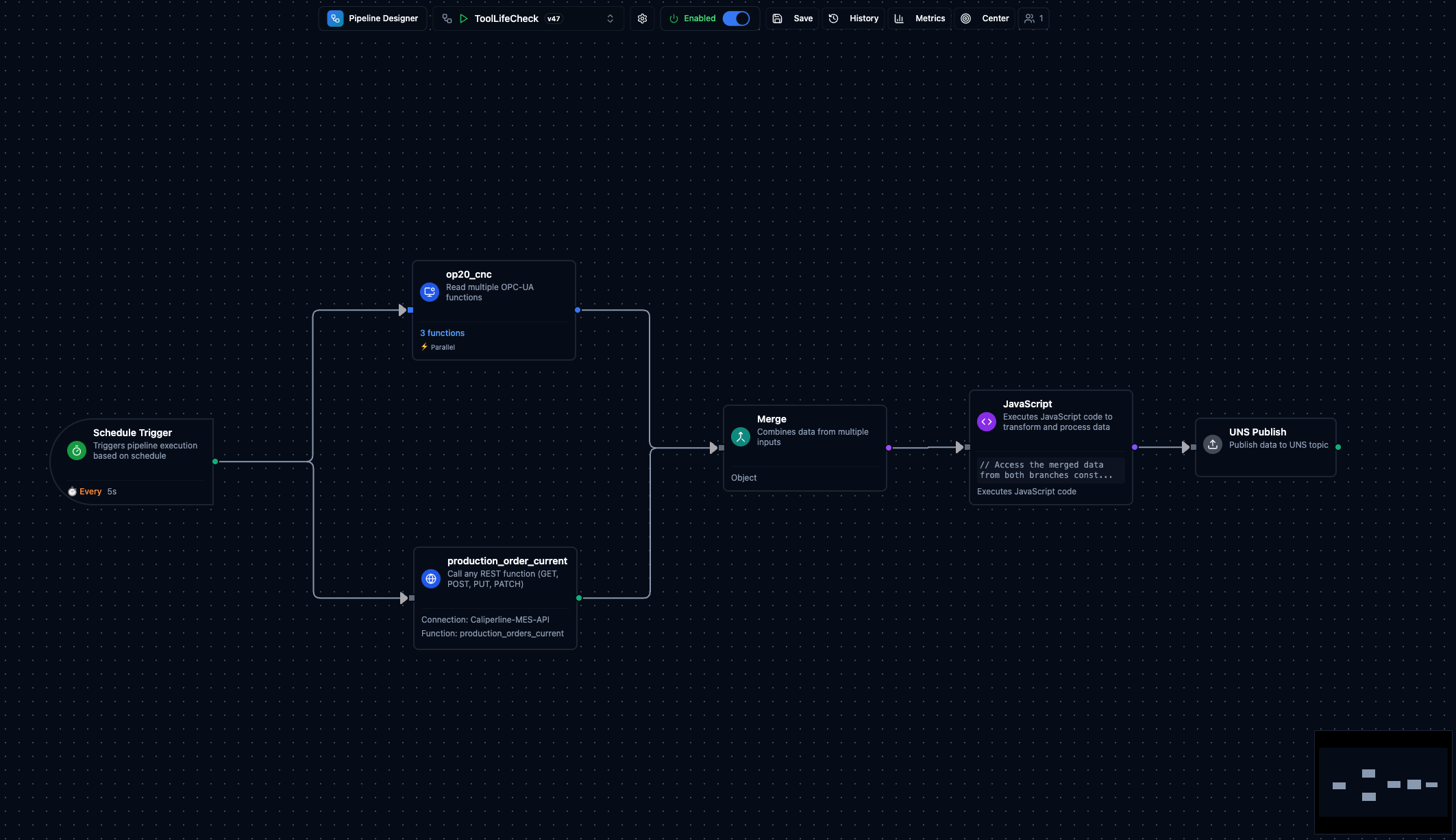 Connect PLCs, historians, and IT systems while orchestrating flows with the visual pipeline designer.