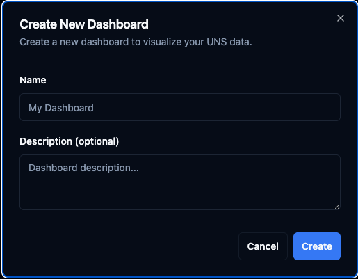 Click + New Dashboard to open the creation dialog. Enter a Name for the dashboard and an optional Description, then click Create. The dashboard opens in edit mode immediately, ready for you to add panels.