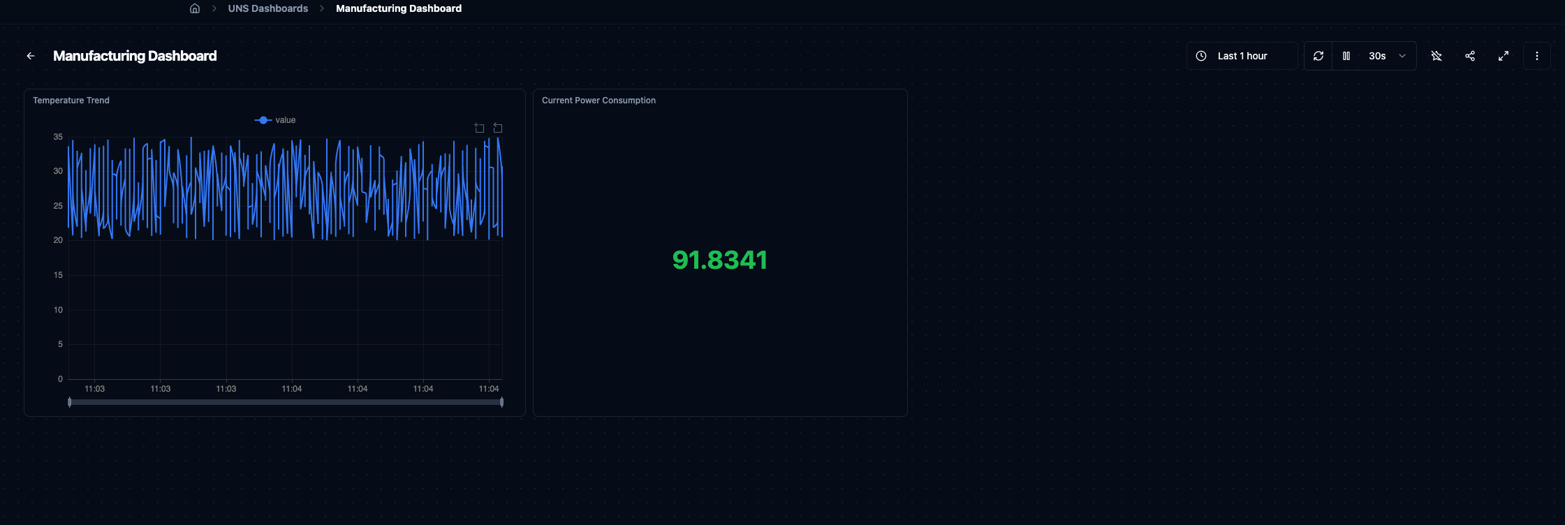 Dashboards let you build custom monitoring screens from UNS data. Pick the topics you care about, choose a visualisation type, and arrange panels on a flexible grid — all in one place. Whether you need a high-level overview of an entire production line or a focused view of a single sensor, dashboards adapt to your use case.