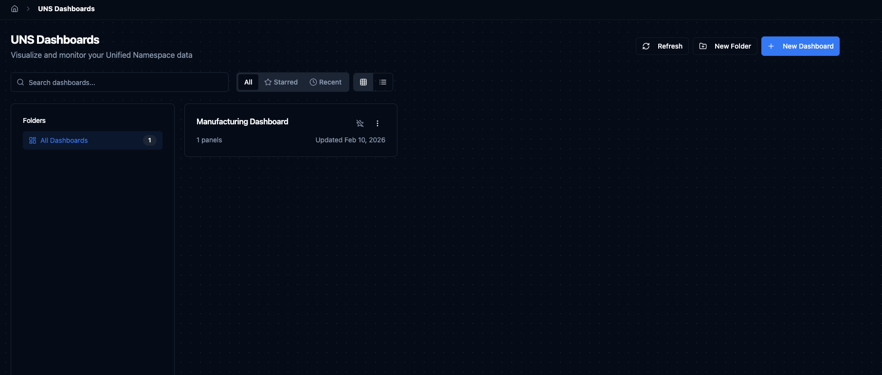 - Folders — group related dashboards together on the left panel (e.g. one folder per production line or per team). Click New Folder to create one.
