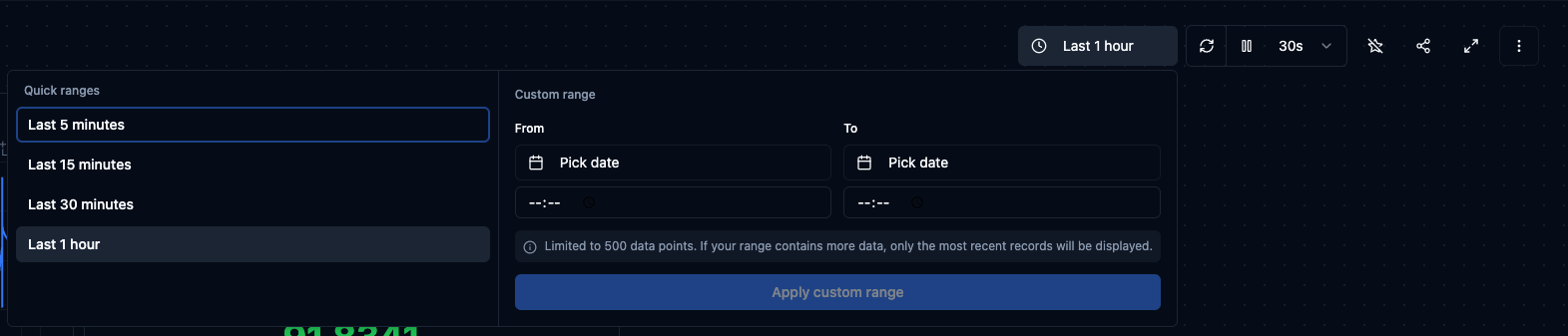 Every dashboard has a global time range that applies to all panels. Click the time range button in the toolbar to open the selector. The left side offers Quick ranges — Last 5 minutes, Last 15 minutes, Last 30 minutes, and Last 1 hour. The right side lets you define a Custom range with exact From and To dates and times.