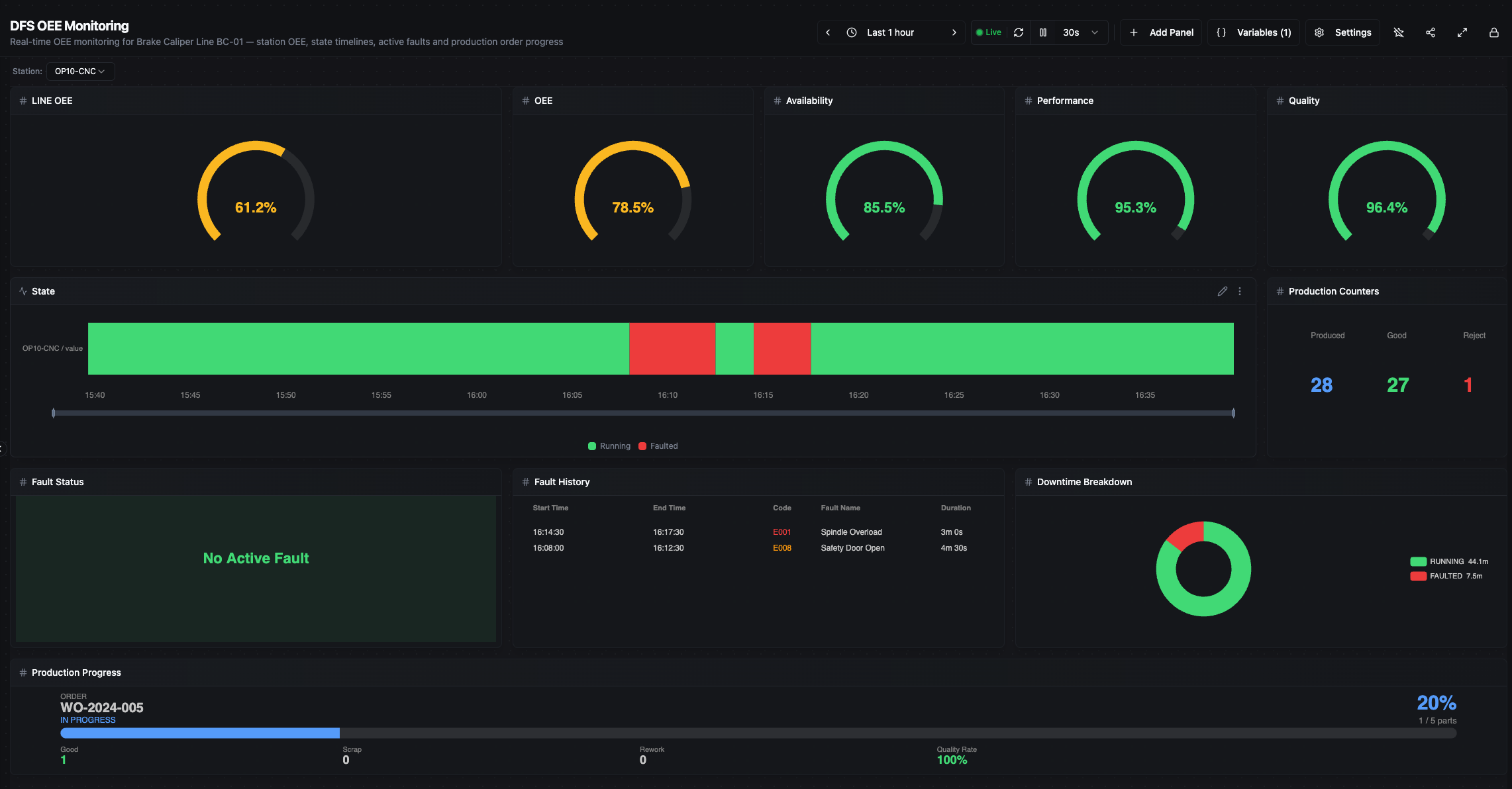 A ready-to-use OEE Monitoring Dashboard — automatically imported with the Digital Factory Simulator.