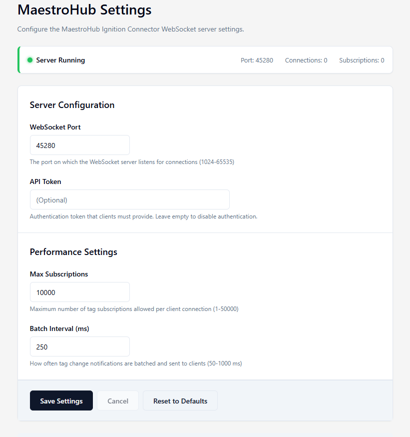 1. Navigate to the module configuration page at http://${Ignition_Host}/res/maestrohub/settings.html (e.g., http://localhost:8088/res/maestrohub/settings.html).