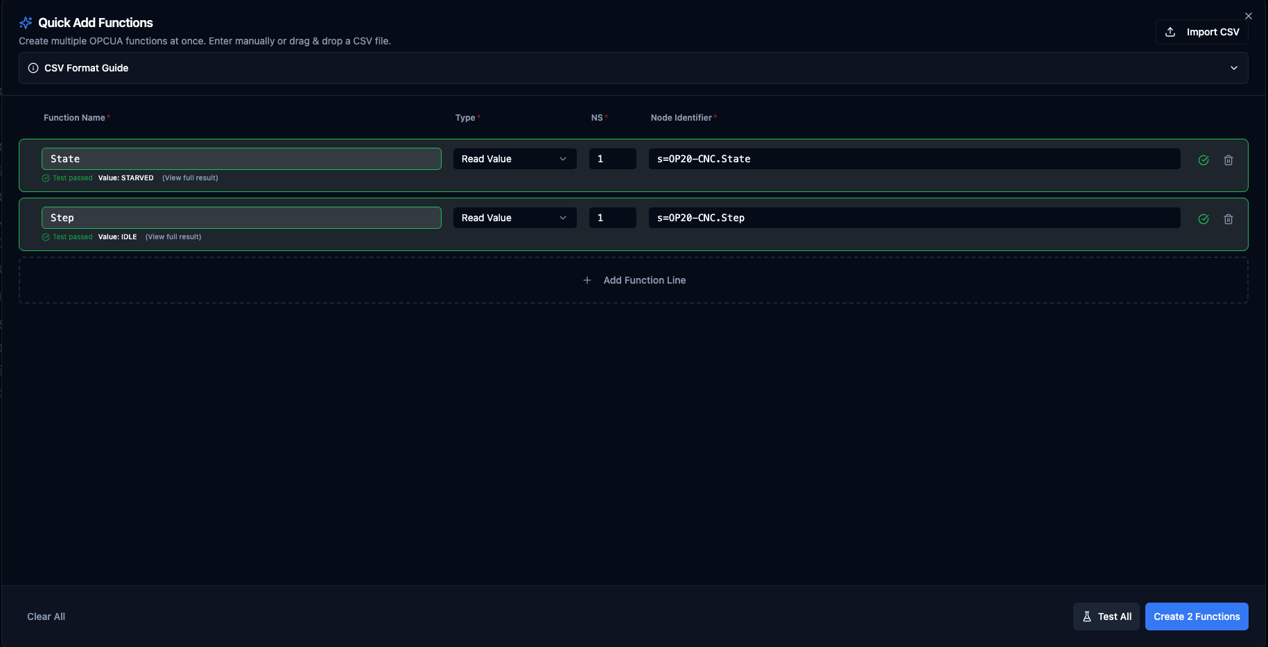 When you need to create multiple OPC UA functions at once, the Quick Add feature accelerates the setup process by allowing batch creation from a table or CSV import.