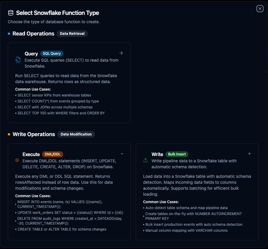 Use the Snowflake functions you create here as nodes inside the Pipeline Designer to interact with your data warehouse alongside the rest of your operations stack. Drag a query, execute, or write node onto the canvas, bind its parameters to upstream outputs or constants, and configure connection-level options without leaving the designer.