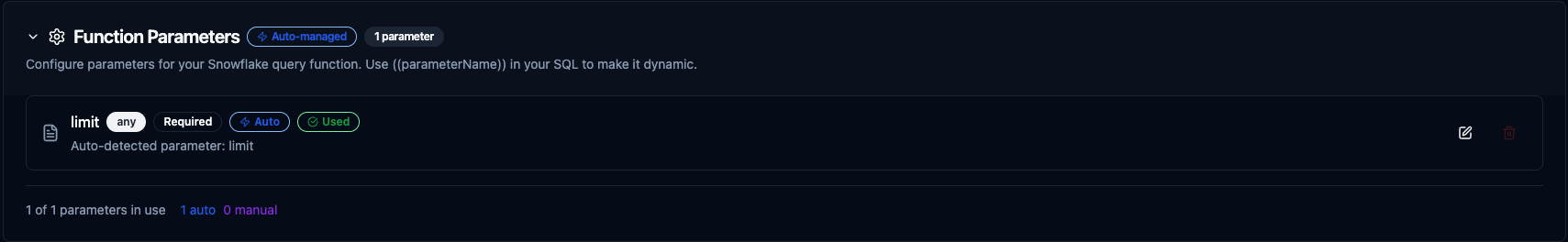 Snowflake query function creation interface with SQL editor and parameter configuration