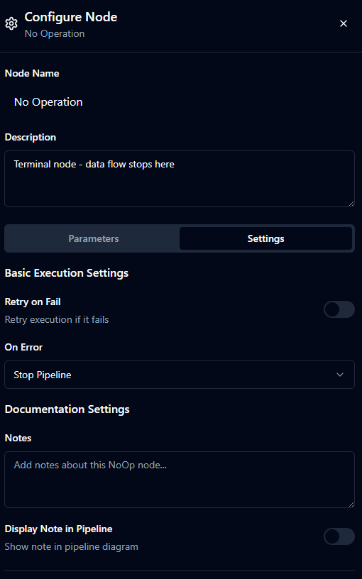 The No Operation Node provides an explicit, documented way to terminate a pipeline branch once its work is complete. It accepts inbound packets, performs no transformation, and signals to every collaborator that execution is meant to stop at that point.