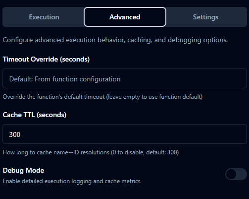 | Timeout Override | number | empty | Optional timeout (seconds) overriding the function’s default timeout. |