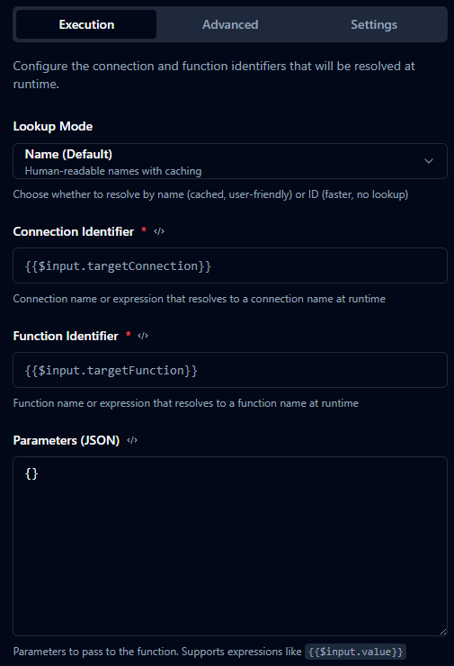 Instead of hard-coding a single connection profile and function in the node configuration, you provide expressions that resolve to the right connection and function for each execution, with optional caching for high performance.