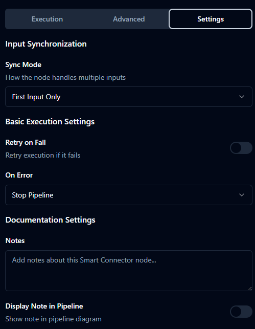 | Input Sync Mode | string | "first" | When multiple upstream inputs feed this node, "first" executes as soon as one packet arrives. |