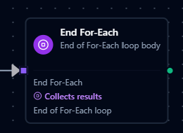 • Access results from End For-Each — the aggregated LoopResult is on the End For-Each node (e.g., $node["End For-Each"].results), not the For-Each node.