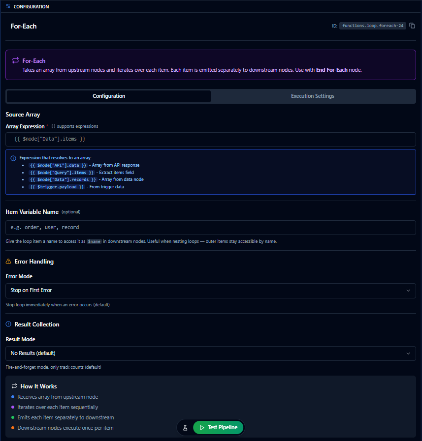 The For-Each Loop turns a single array payload into multiple executions of downstream nodes — one run per item. Instead of building manual loops or complex branching, you define a single array expression, and the pipeline engine fans out the flow automatically. A companion End For-Each node marks the boundary of the loop body.