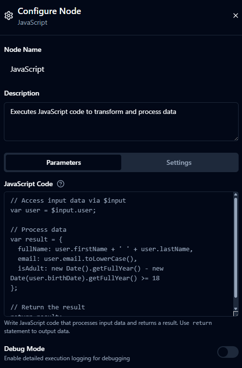 | Debug Mode | boolean | false | Enables verbose execution logging. |