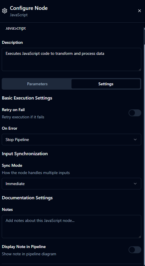 | On Error | string | "Stop Pipeline" | "Stop Pipeline" fails the branch, "Continue Execution" forwards an error payload, "Retry Node" replays the script under retry policies. |