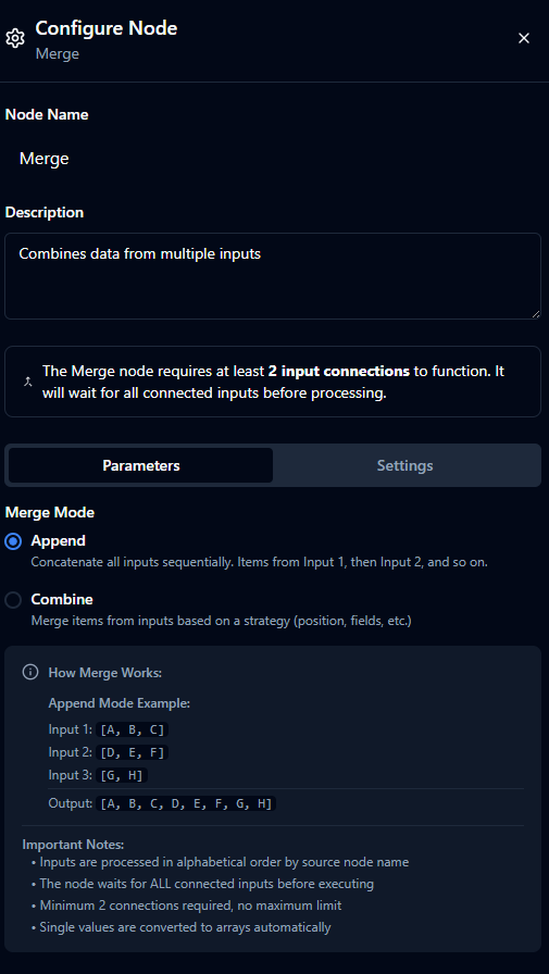 append(default) concatenates all incoming arrays or items in deterministic order (sources sorted alphabetically by node name).combinezips items positionally, producing composite objects; unmatched positions can be preserved or dropped.- Other modes remain reserved for future releases and are rejected during validation if selected.