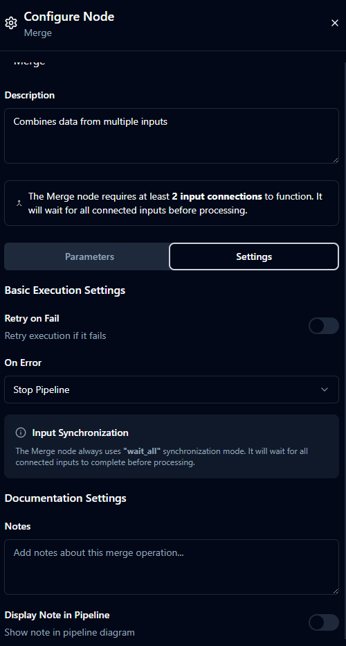 wait_all; the node fires only after every upstream branch completes. - Validation ensures at least two connections exist to prevent misconfigured merges.