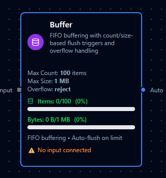 The Buffer Node accumulates incoming payloads in a FIFO queue and automatically flushes them when either the item count or the serialized byte footprint crosses a configured threshold. Because the node persists its state between executions, it is well suited for batch processing, load smoothing, and integrating with downstream systems that expect grouped payloads instead of single records.