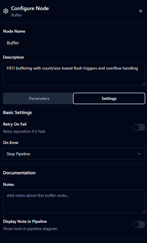 | On Error | string | "Stop Pipeline" | "Stop Pipeline" halts the branch, "Continue Execution" forwards an error packet, "Retry Node" replays the node under retry rules. |