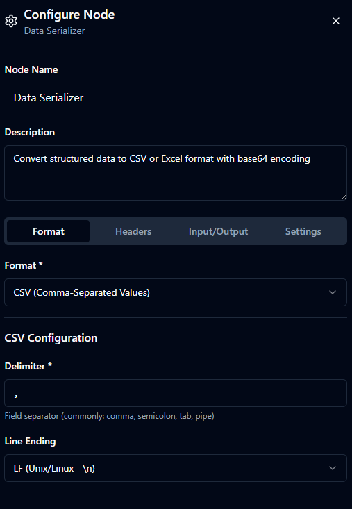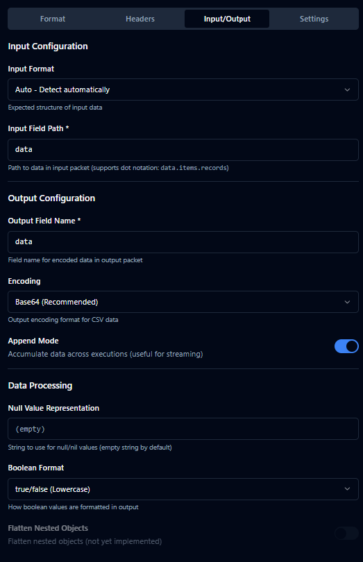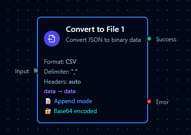 .csvfile:format: 'csv'delimiter: ',',lineEnding: 'LF'headerMode: 'auto',includeHeaders: trueinputFormat: 'arrayOfObjects'inputField: 'data.records',outputField: 'data'encoding: 'base64'(recommended for binary-safe transport)appendMode: falsefor one-shot exports