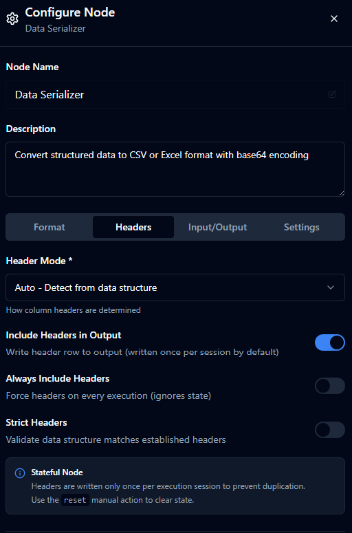 Headers are written once per execution session. Use the node's reset manual action to clear state and force a new header write when needed.