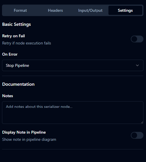 | On Error | enum | stopPipeline | One of: stopPipeline, continueExecution, retryNode. |