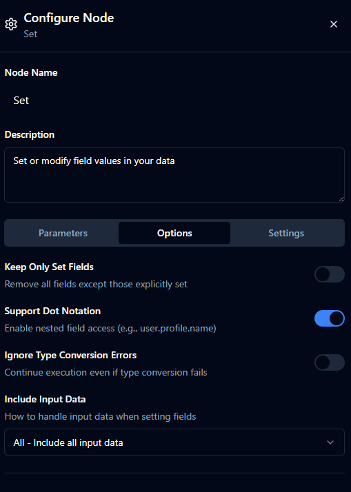 The Set Node reshapes payloads by adding, updating, or removing fields in flight. It supports both click-to-configure field mappings and JSON-based templates, allowing teams to enrich data, normalize schemas, or inject metadata without writing custom code. Expressions are fully supported so downstream nodes receive the exact structure and values they expect.