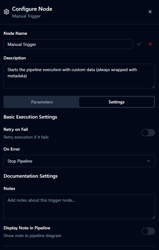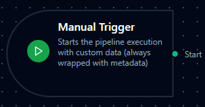 The Manual Trigger Node serves as the entry point for user-initiated pipeline executions in MaestroHub's orchestration platform. Unlike automated triggers, this node provides complete control over when and how your workflows start, making it ideal for testing, controlled operations, and user-driven processes.