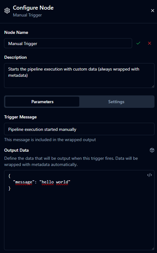 | Output Data | JSON Object or null | null | Initial data payload for the pipeline. Always wrapped with metadata automatically |