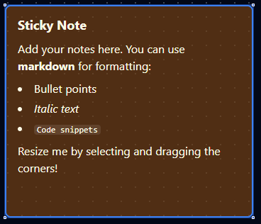 | Note Content | string | "Add your note here" | Markdown text rendered inside the sticky note. |