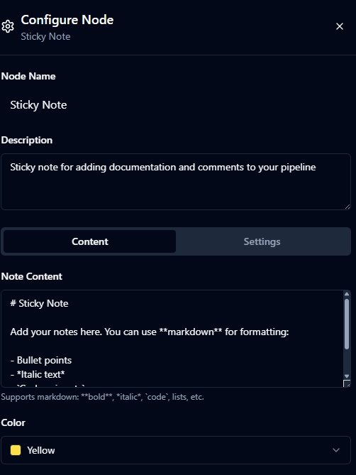 The Sticky Note Node is an informational element you can drop onto the pipeline canvas to leave rich, Markdown-supported documentation. It never runs, has no ports, and exists purely to communicate intent, instructions, or troubleshooting tips to collaborators. Treat it as an in-line knowledge base that travels with the pipeline definition.