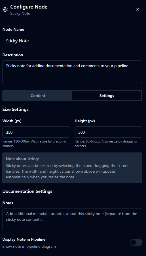 widthandheightnumerically or drag the note’s resize handles when selected. - Dimensions persist with the pipeline definition so every viewer sees the same layout.