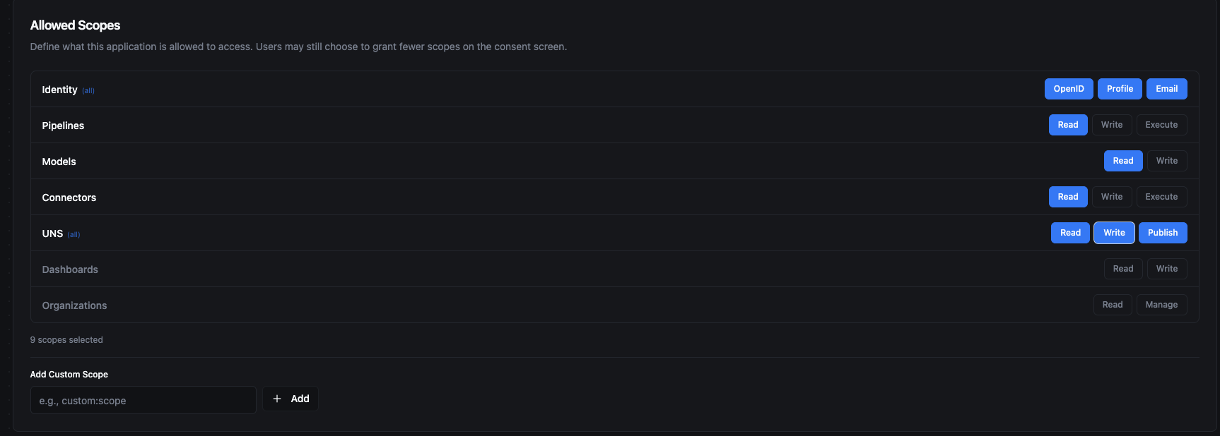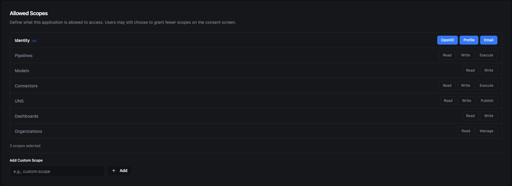 - Custom Scopes — You can add custom scope strings for application-specific needs. Enter the scope name and click Add.