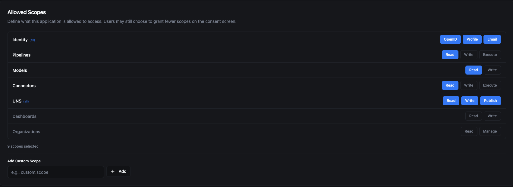 Step 3 — Select allowed scopes. Grant the scopes your dashboard needs. In this example, the dashboard needs to read pipelines and models, read connector statuses, and have full access to UNS topics (read, write, publish). OIDC identity scopes (OpenID, Profile, Email) are included to identify the logged-in user.